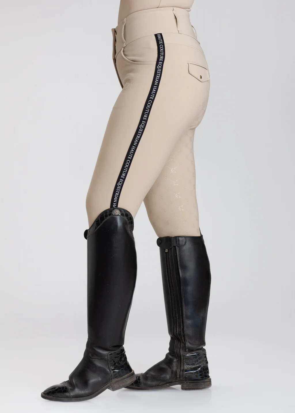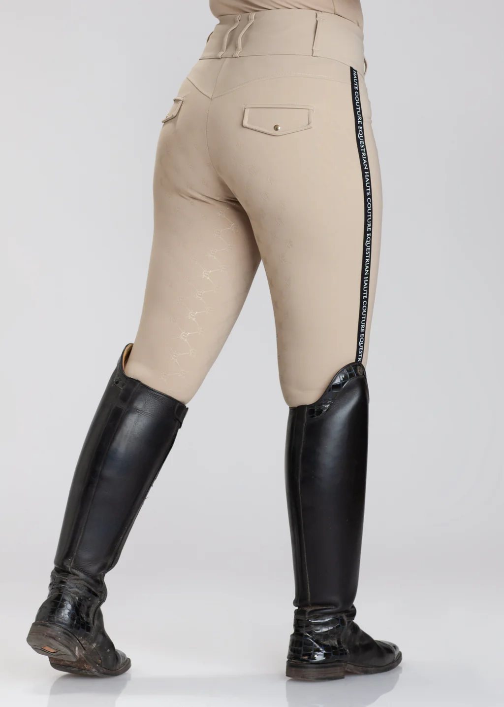 Siempre con el toque caracteriza a Haute Couture Equestrian resaltamos la zona del grip de alta calidad. Logo con grip de color negro Jacquard en lateral de las piernas con el logo de la marca.