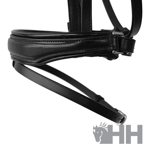 Cabezada para filete con un solo montante y realizada con cuero de primera calidad y hebillaje de acero inoxidable. Muserola acolchada anatómica extra ancha y cierrabocas. Cierre de la muserola de dos piezas con acolchado y correa para tensar. Frontalera y vivo de la muserola realizados en cuero charol. Incluye riendas de lona con tacos.