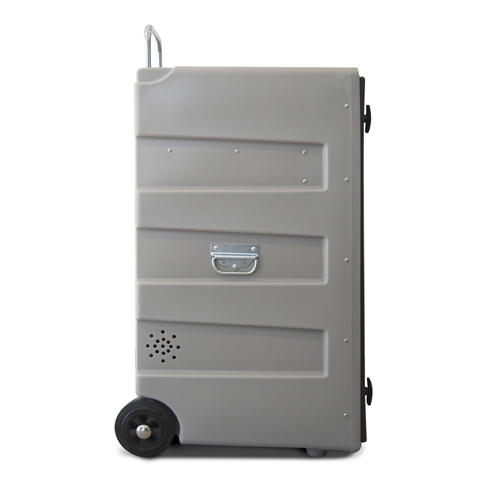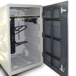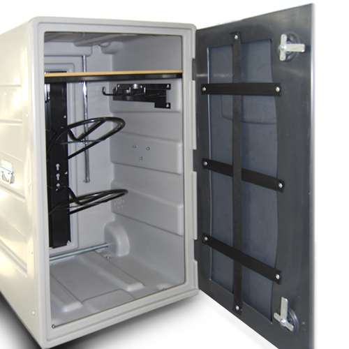 Realizado en plástico polietileno. Dos portasillas, estatería y diversos ganchos porta-bridas. Dos cerraduras con llave. Asa exterior plegable para su fácil transporte y diseñado para poder ser apilado. Dimensiones 110x62x60 cm. Peso 25 kg. Color GRIS.