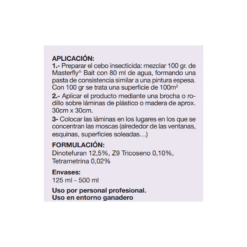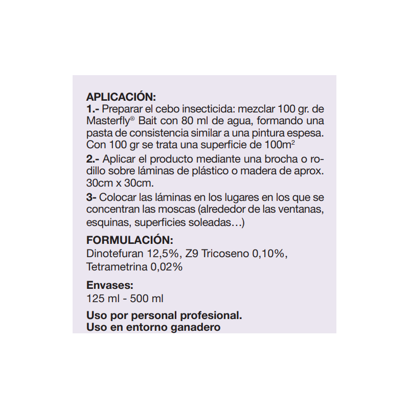 Masterfly se aplica en dosis de 100 gramos de producto para una superficie de 100m2. Es muy importante concentrar la aplicación en zonas determinadas. Identificar las zonas donde prefieren posarse las moscas y aplicar la solución en esas áreas específicas.