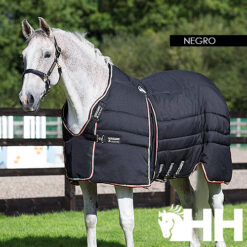 Tejido exterior poliéster ripstop 1000 D. 400 g de relleno. Forma patentada en la zona de las manos para una libertad total de movimientos. Pieza delantera ajustable para evitar roces en la parte inferior del cuello y el pecho. Acolchado en la cruz para mayor comodidad del caballo.