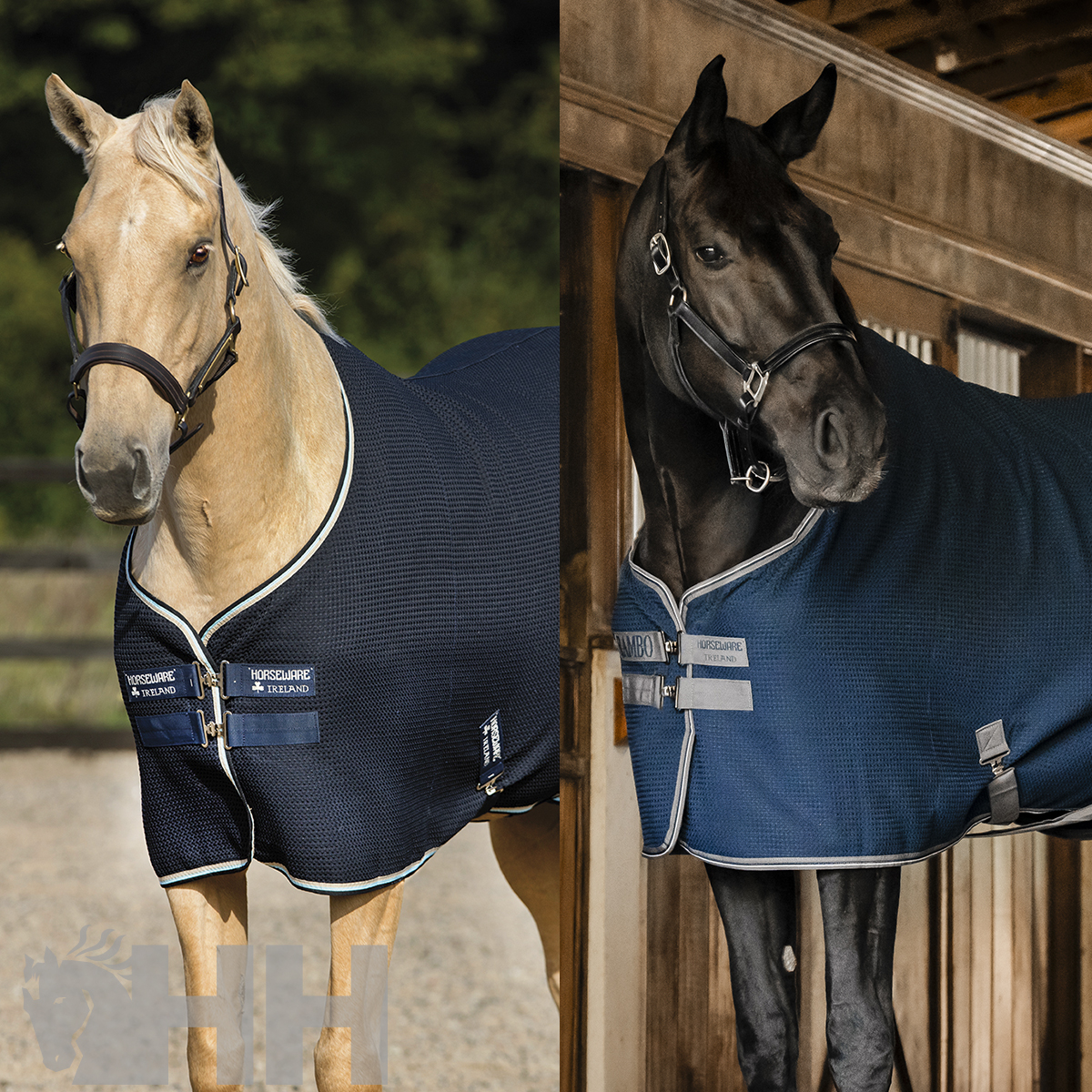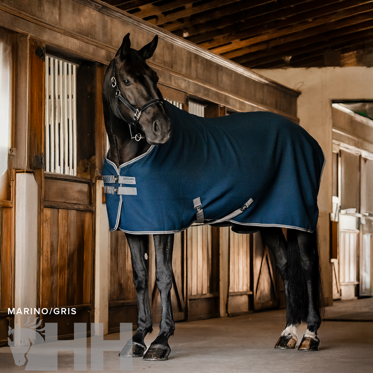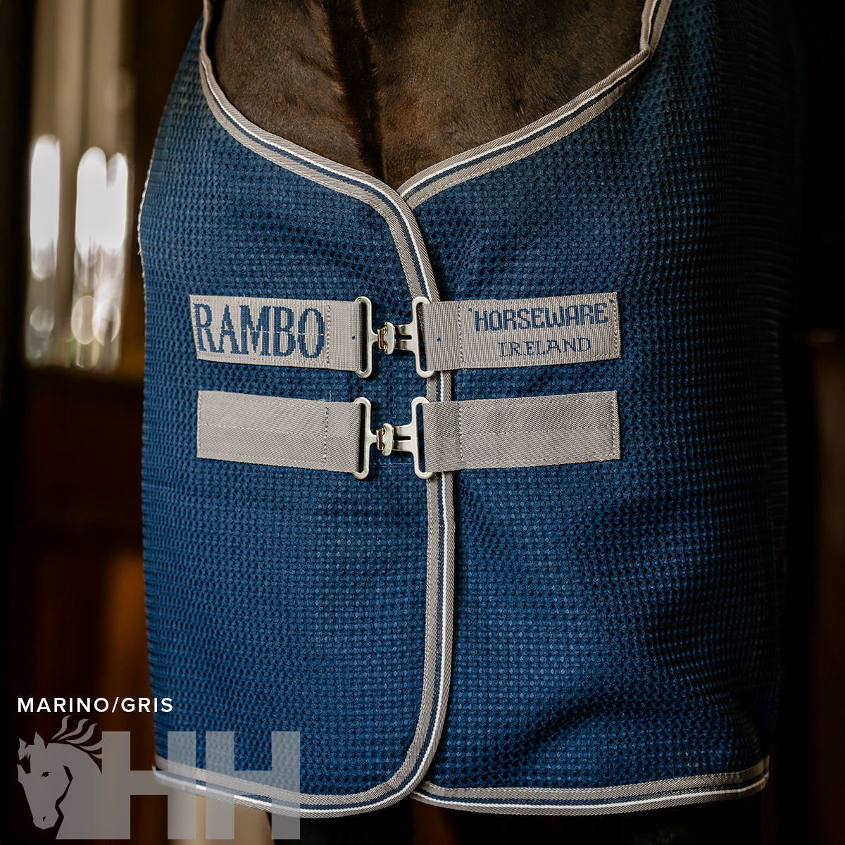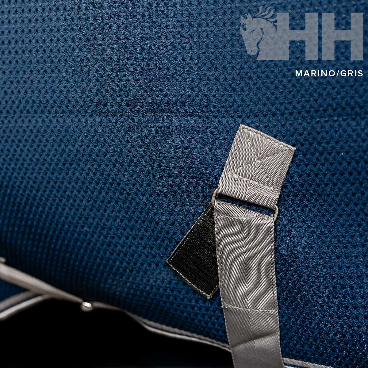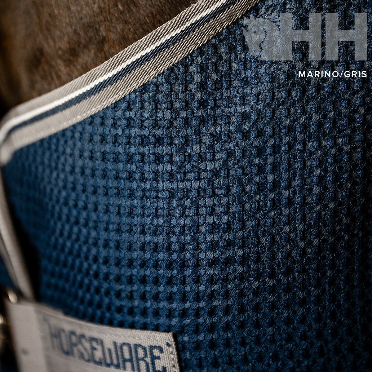 Poliéster exterior en recuadros con la tecnología de control de la humedad. La tela blanca refleja el calor del sol, mientras que el diseño en recuadros favorece el control de la humedad y ayuda a secar al caballo, rápida y eficazmente, absorbiendo la transpiración de este. Cierres dobles delanteros, cinchuelos cruzados y cordón en la cola.