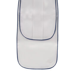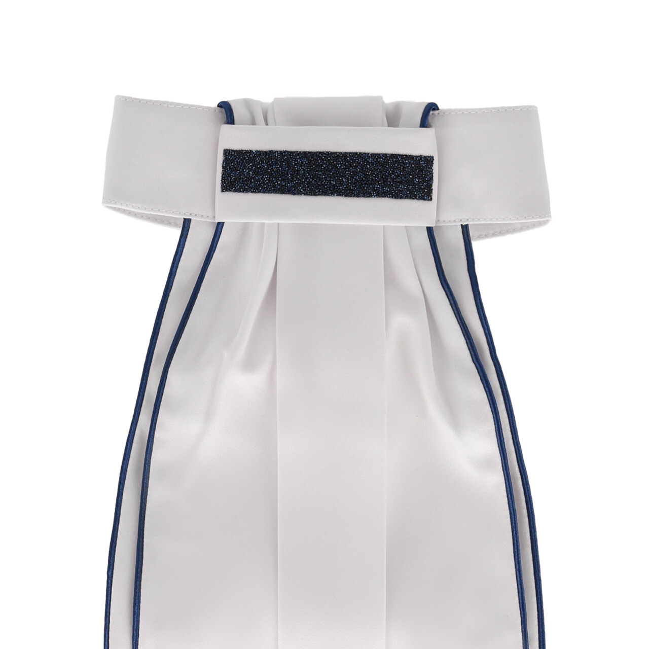 Esta corbata de satén tiene un hermoso acabado brillante, un ribete y una «Q» bordada en la parte inferior. Se abrocha fácilmente con un cierre de velcro.
