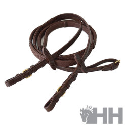 Riendas de goma realizadas con el cuero de alta calidad LEXHIS GREEN curtido de forma ecológica y vegetal en USA. En este caso la goma utilizada es de nuevo diseño con unas excelentes cualidades de agarre. Los tacos cosidos a las gomas de las riendas están realizados también en cuero. El ancho de la goma es de 1/2″.