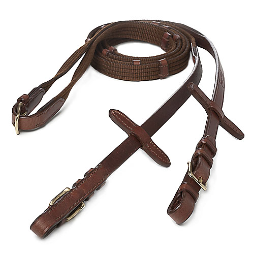 Riendas realizadas con lona muy resistente y topes de cuero. El cuero utilizado es cuero vegetal de primera calidad procedente de USA y curtido de forma ECOLÓGICA también en USA. Ancho 5/8 » . Posibilidad de hebillaje dorado ó inoxidable.