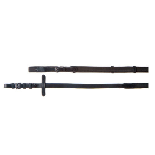 Riendas de lona muy resistente con filamentos de goma en el centro para un mayor agarre del jinete. Medida FULL. Colores: marrón y negro.